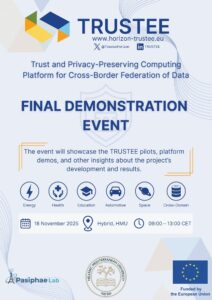 Με χαρά σας προσκαλούμε στο Τελικό Demo Event του Ευρωπαϊκού έργου TRUSTEE, που θα πραγματοποιηθεί στις 18 Νοεμβρίου 2025, από το Ελληνικό Μεσογειακό Πανεπιστήμιο (HMU) και το Pasiphae Lab, στο Ηράκλειο Κρήτης. Η εκδήλωση είναι ανοιχτή σε όλους για διαδικτυακή συμμετοχή.
